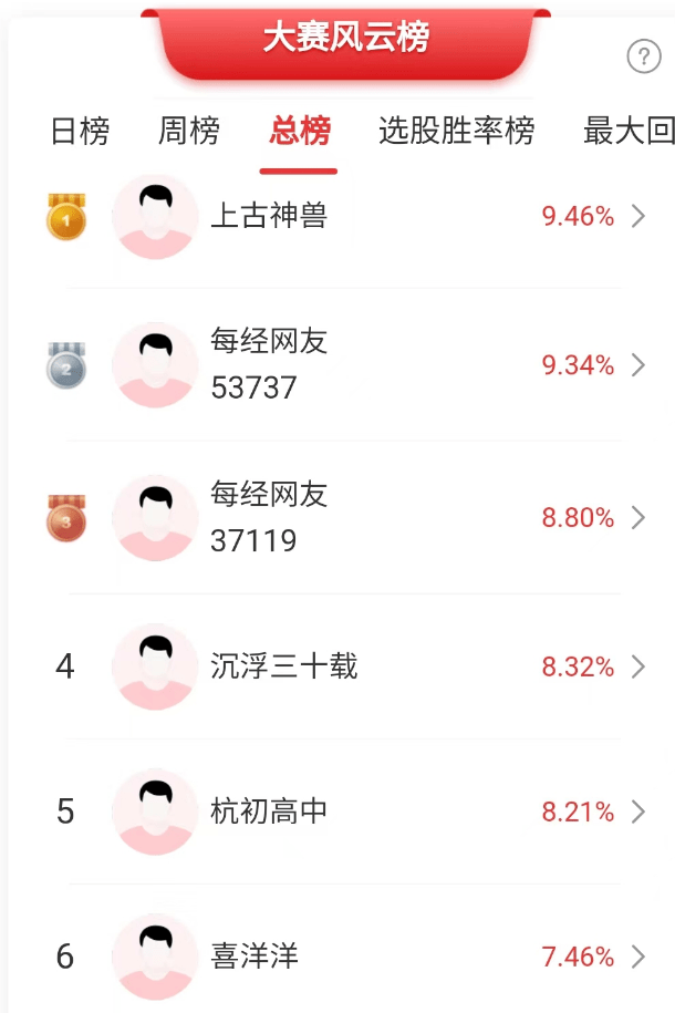 从前几名选手的持仓来看,第一名选手“上古神兽”抓住了光刻胶概念股强力新材的机会,第二名选手“每经网友53737”抓住了光弘科技的机会,第三名选手“每经网友37119”抓住了折叠屏概念股精研科技的机会。第四名选手“沉浮三十载”抓住了天龙集团的机会。第五名“杭初高中”、第六名“喜洋洋”以及第11名和12名也抓住了精研科技的机会。