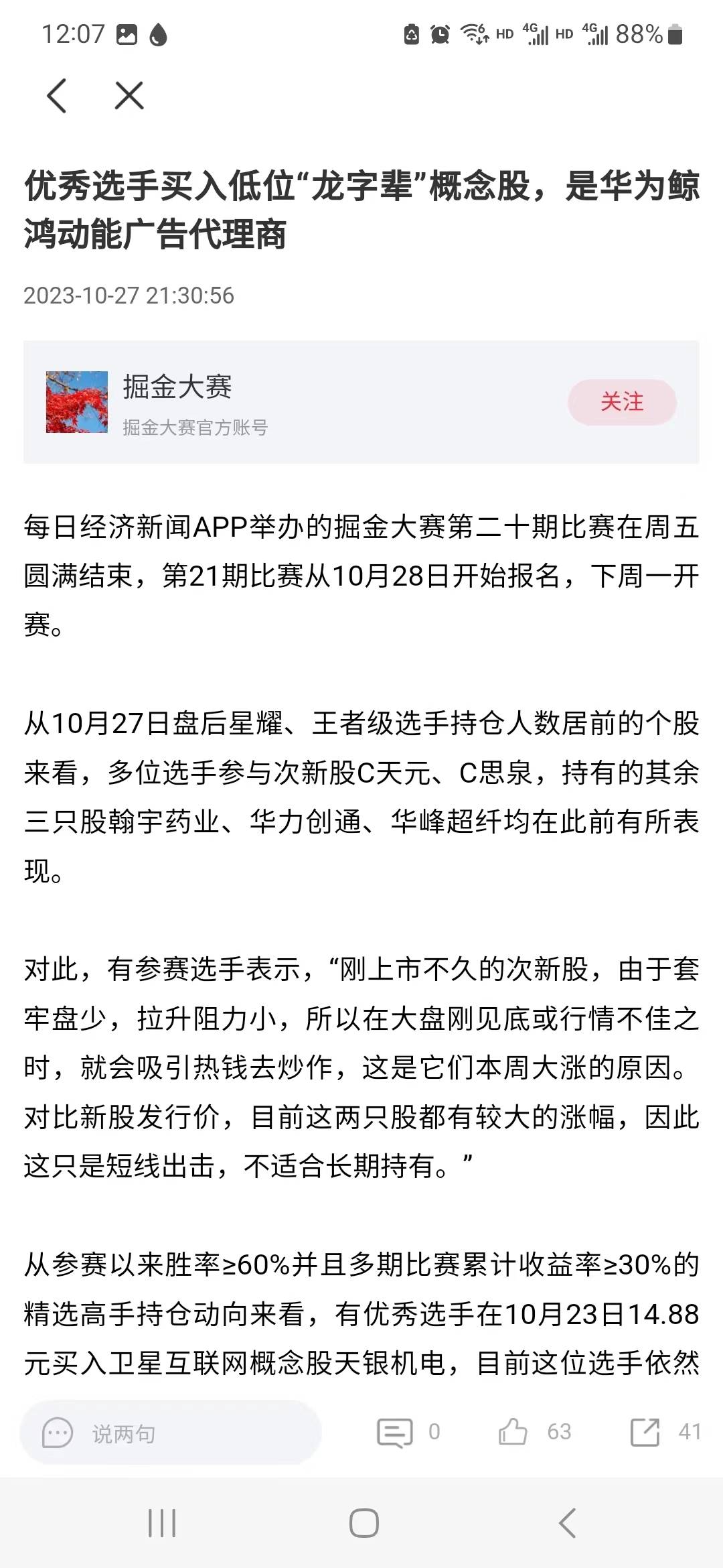 在每日经济新闻APP私人订制的掘金股吧中,在上周五发布的大赛高手持仓中,就提到了有优秀选手布局了“龙字辈”的天龙集团,该股是是华为鲸鸿动能广告代理商。
