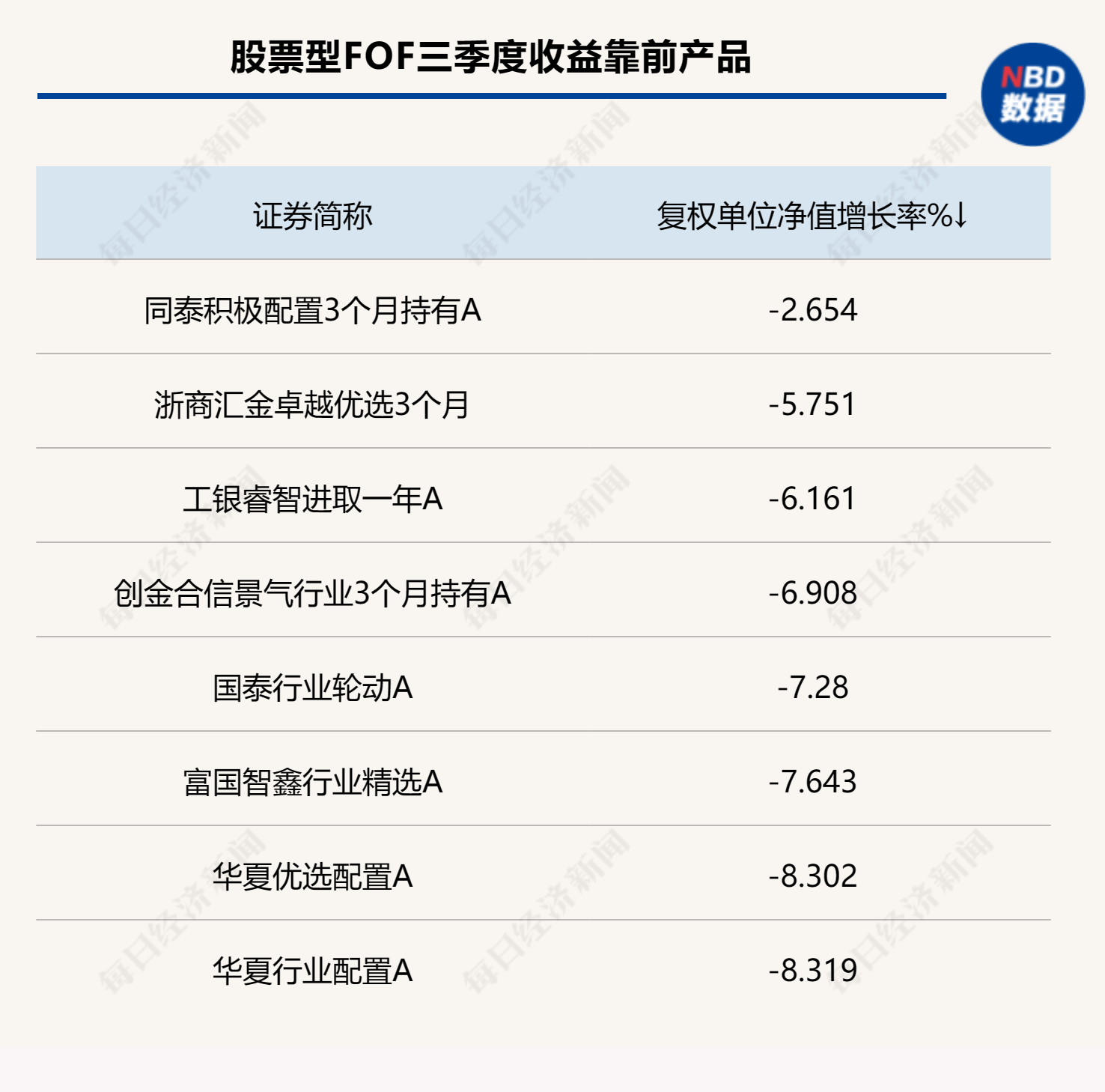 具体看来,2023年三季度,上证指数跌2.78%,创业板指跌9.53%,科创50指数跌11.67%,是一季主要指数普跌且创出年内甚至是历史新低的走势。在这样的环境之下,整体表现最好的为债券FOF基金,跌幅为0.17%;表现最差的为股票FOF基金,跌幅为7.35%。