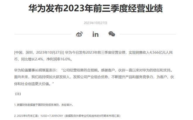 近期,华为官网发布了2023年前三季度的经营数据,总营收4566亿元,同比增长2.4%,净利润16%,计算下来,今年前三季度华为净利润为730.56亿元。什么概念呢?