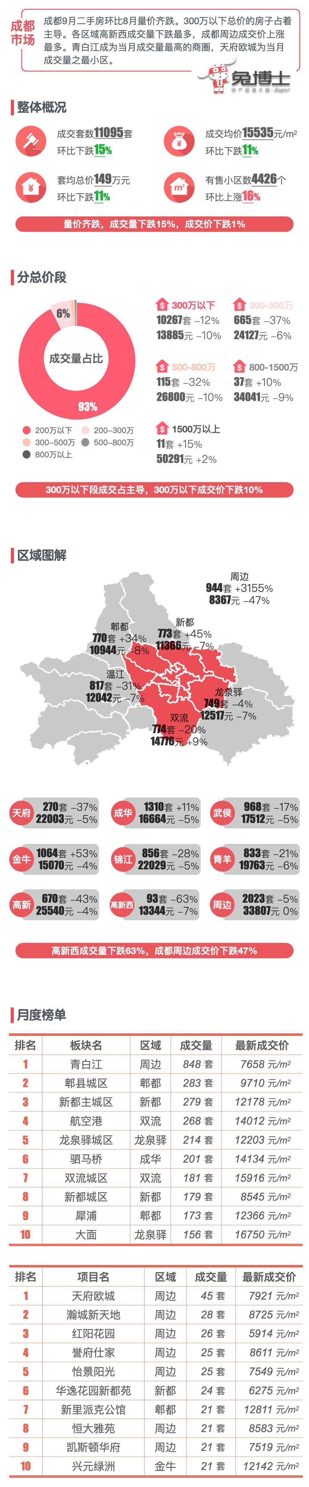 成都9月二手房环比8月量价齐跌。300万以下总价的房子占着主导。各区域高新西成交量下跌最多,成都周边成交价上涨最多。青白江成为当月成交量最高的商圈,天府欧城为当月成交量之最小区。