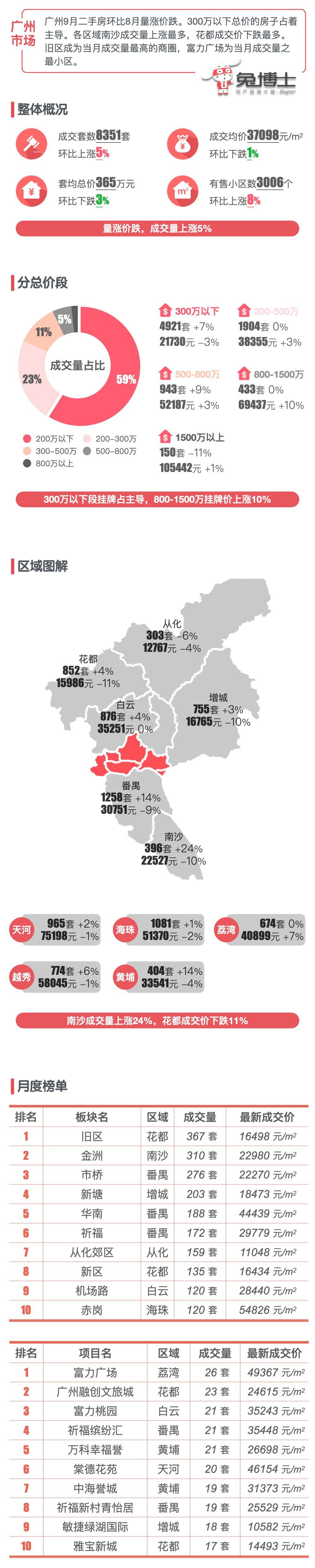 广州9月二手房环比8月量涨价跌。300万以下总价的房子占着主导。各区域南沙成交量上涨最多,花都成交价下跌最多。旧区成为当月成交量最高的商圈,富力广场为当月成交量之最小区。