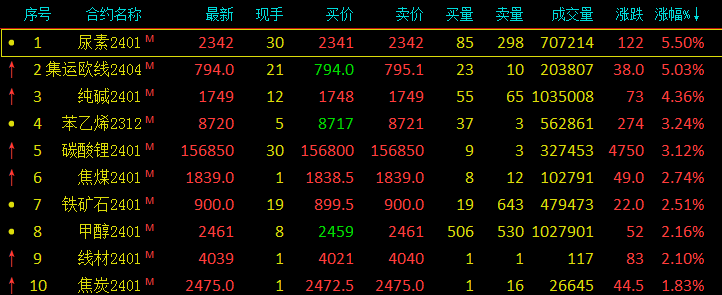 10月30日国内商品期货普遍收涨,尿素、集运欧线涨超5%,纯碱涨超4%,碳酸锂、苯乙烯涨超3%,焦煤、铁矿石、甲醇涨超2%;苹果、橡胶跌超2%,红枣、20号胶跌超1%。
