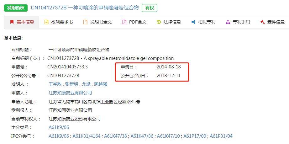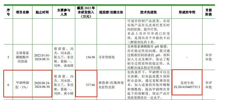 与此类似的还有,甲硝唑凝胶(1%)项目研发起止时间是2020.08.24-2024.06.30,截至2022年末投入了317.66万元研发费,形成了发明专利ZL201410405733.3。但公开资料显示,上述专利为2014年8月申请,2018年12月11日已经公开(公告),并非2020.08.24-2024.06.30期间形成的专利;而该专利发明人王学政、张新明、尤斌、周越强也并非招股书披露的项目要参与人员。