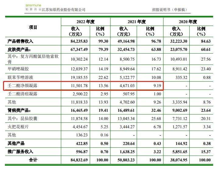 皮肤类产品、尤其祛痘产品是知原药业主要营收来源,2020年至2022年,皮肤类产品销售收入占比从60.61%增至79.39%。知原药业若能成功上市,有望成为“A股祛痘第一股”。