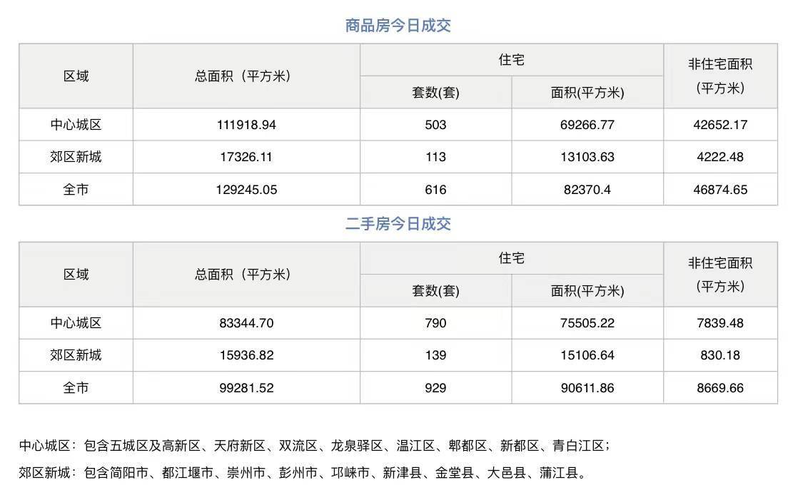 据成都市住建局住建蓉e办数据显示,2023年10月27日,成都市全市商品房成交(备案)总面积129245.05平方米;其中商品住宅成交(备案)616套,商品住宅成交(备案)面积82370.4平方米。二手房成交(备案)总面积99281.52平方米,其中二手住宅成交备案929套,二手住宅成交(备案)面积90611.86平方米。