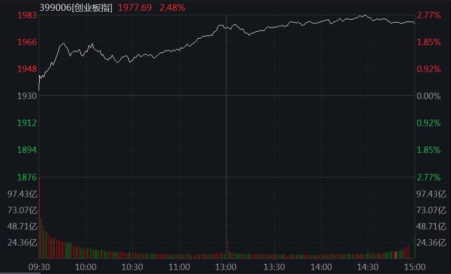 截至收盘,上证指数涨0.12%,报3021.55点;深证成指涨1.61%,报9927.99点;创业板指涨2.48%,报1977.69点。两市成交额时隔2个月重返万亿元。