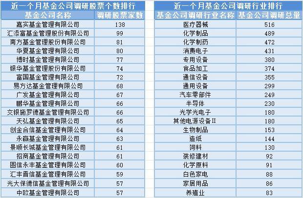 近一个月(9月30日-10月30日),嘉实基金参与公司调研的数量最多,共调研138家上市公司,然后调研较为活跃的还有汇添富基金、南方基金、华夏基金,分别调研99家、81家、80家上市公司;从调研行业上来看,基金公司对医疗器械行业的上市公司调研次数最多,共有516次,其次是化学制药行业,基金公司调研了489次。