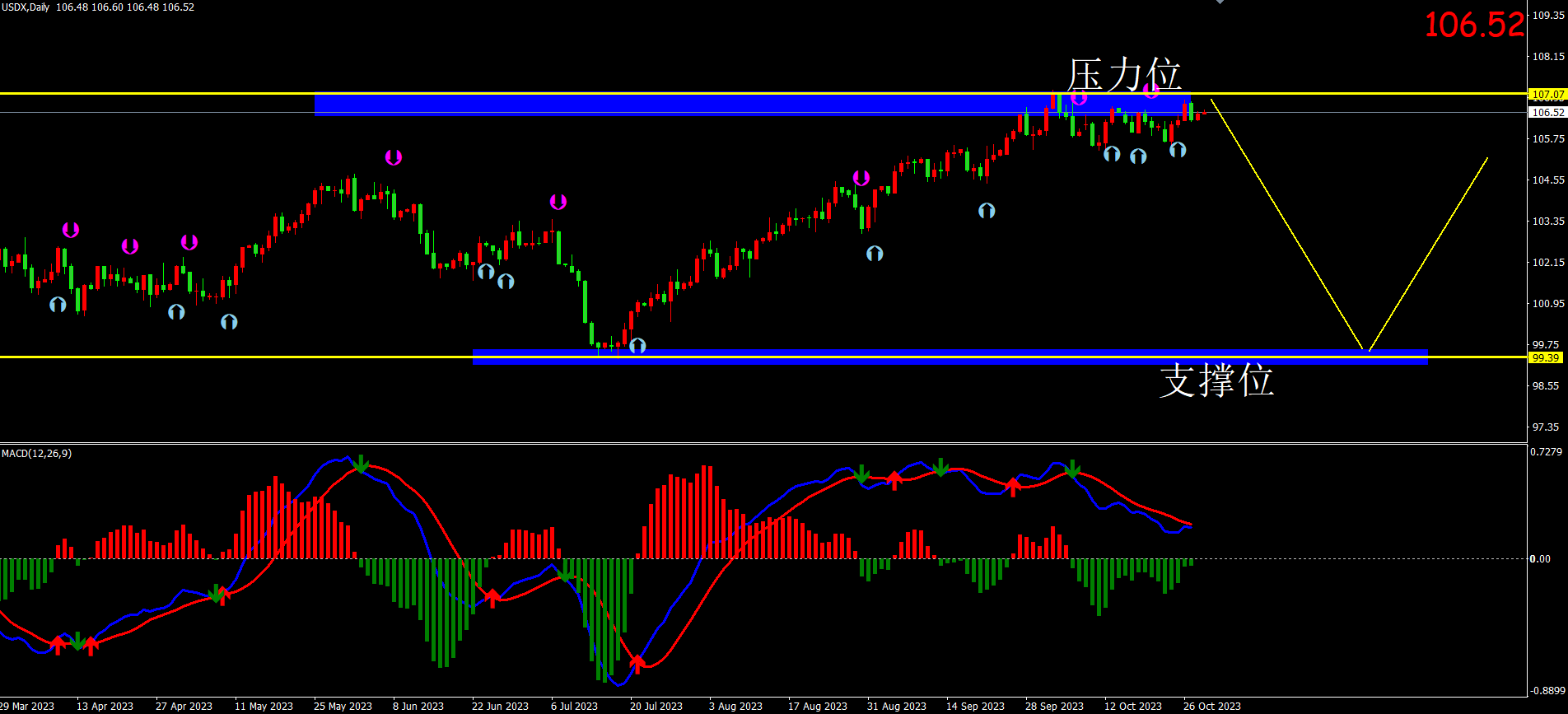 美元指数:图表显示目前美指为震荡反弹行情。关注压力107.00位置。