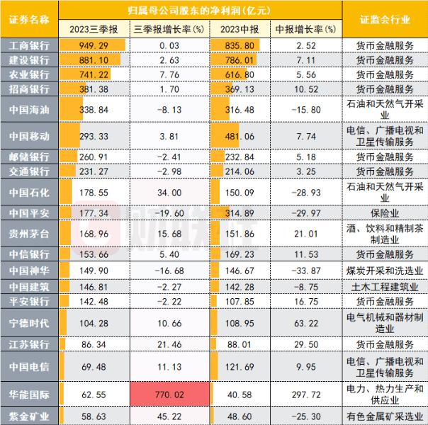 目前已披露2023三季报的上市公司中,前三季度A股归母净利润总额居前的仍为银行与油气、通信龙头,但工商银行、建设银行、招商银行、交通银行等Q3盈利增速均有所下滑。油气龙头之中,中国石油尚未披露三季报,但中国石化与中国海油在Q3均实现盈利同比修复,与PPI同比变化方向符合。中国神华、紫金矿业三季报盈利能力也有增长。