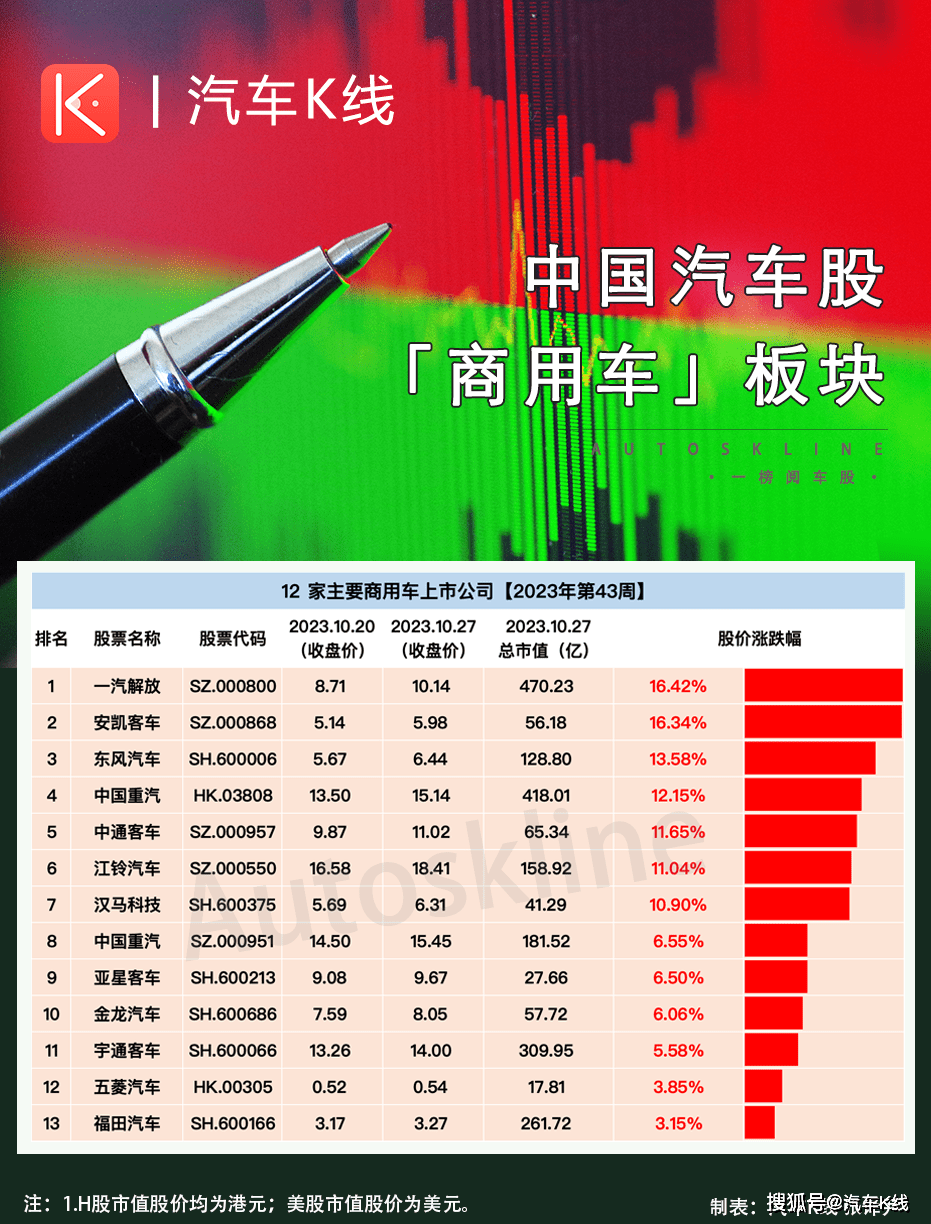 具体来看,一汽解放以16.42%的周涨幅领涨,总市值为470.23亿元;安凯客车和东风汽车分别以16.34%和13.58%的周涨幅排在第2、3位。