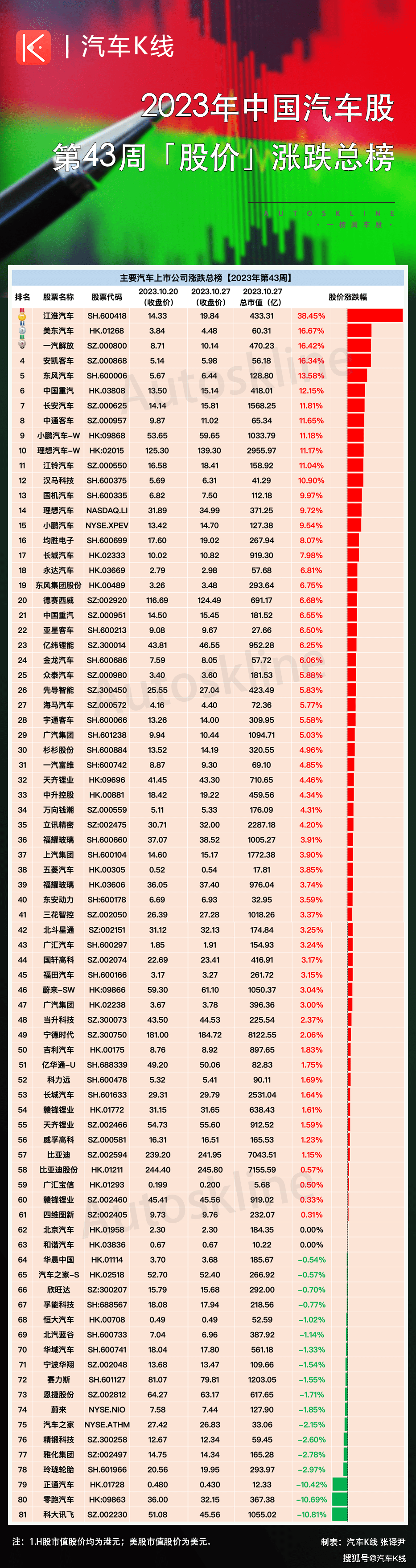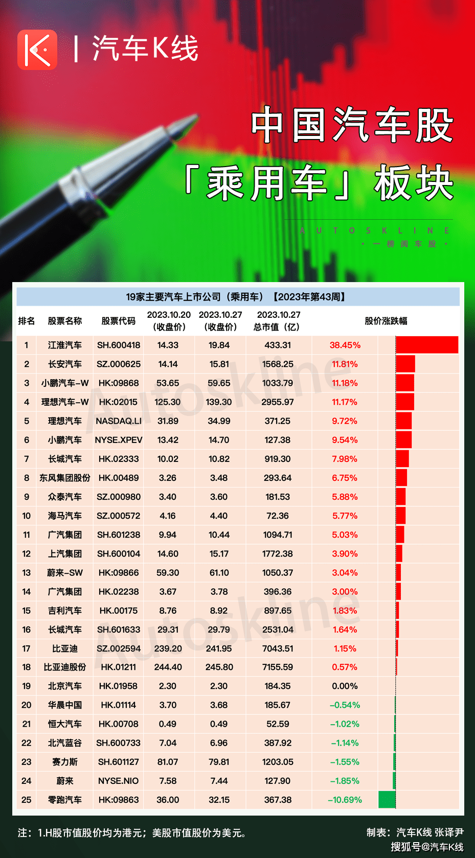 具体来看,江淮汽车以38.45%的周涨幅领涨该板块及总榜单,一周市值增至433.31亿元;长安汽车和小鹏汽车港股分别以11.81%和11.18%的周涨幅位列第2、3位;其余上涨个股除理想汽车港股外,涨幅均在10%以内。