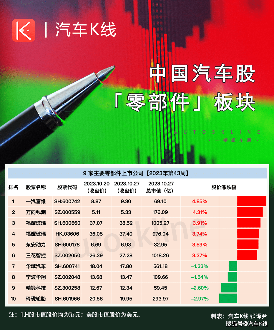 具体来看,一汽富维以4.85%的周涨幅领涨,一周市值涨至69.1亿元;万向钱潮和福耀玻璃A股分别以4.31%和3.91%的周涨幅排在第2、3位。