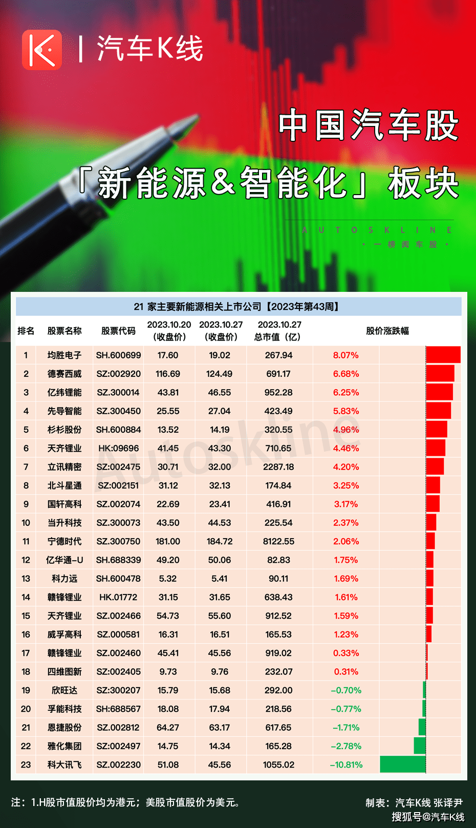 具体来看,均胜电子以8.07%的周涨幅领涨,市值增至267.94亿元;德赛西威和亿纬锂能分别以6.68%和6.25%的周涨幅排在第2、3位。