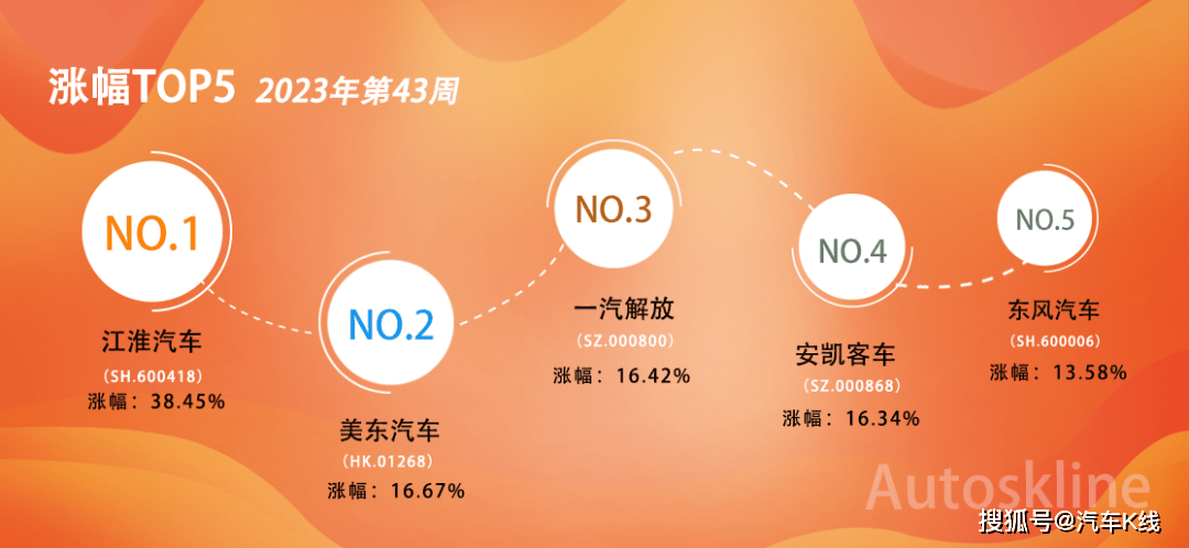 从总榜单来看,涨幅超过10%的个股有12只,其中,江淮汽车以38.45%的周涨幅领涨;美东汽车、一汽解放、安凯客车和东风汽车分别以16.67%、16.42%、16.34%和13.58%的周涨幅位列第2-5位。