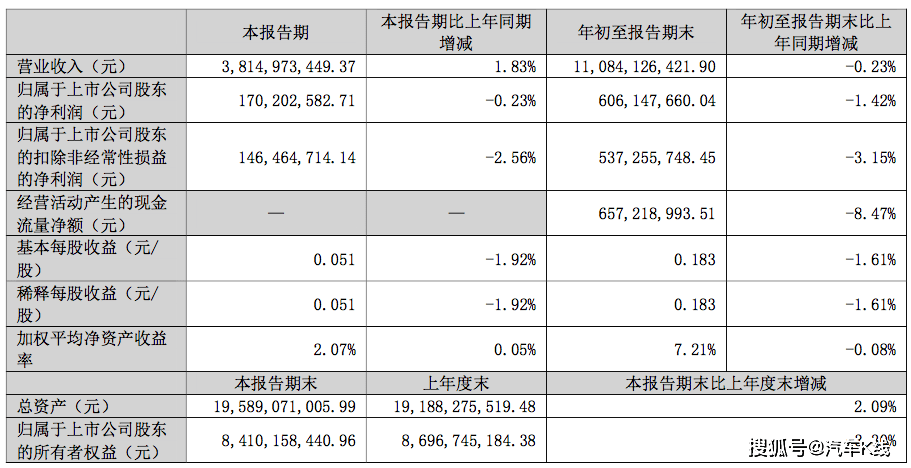 万向钱潮发布前三季度报告显示,前三季度,公司实现营业收入110.84亿元,同比下降0.23%;归母净利润6.06亿元,同比下降1.42%;扣非净利润5.37亿元,同比下降3.15%。