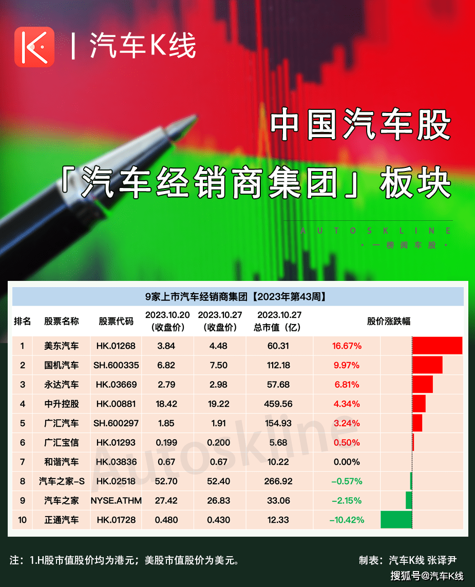 具体来看,美东汽车继续领涨,一周涨幅为16.67%,总市值达60.31亿港元;国机汽车和永达汽车分别以9.97%和6.81%的周涨幅排在第2、3位。