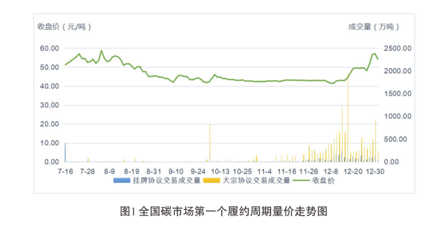 全国碳市场第一个履约周期(2019-2020年度)以发电行业为首个重点行业。据《全国碳排放权交易市场第一个履约周期报告》,截至2021年12月31日,全国碳市场总体配额履约率为99.5%,碳排放配额成交均价42.84元/吨,每日收盘价在40元-60元/吨之间波动。