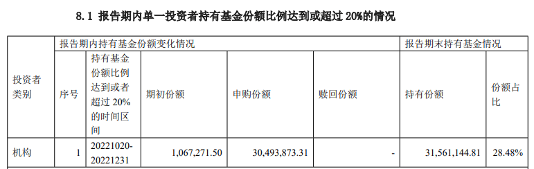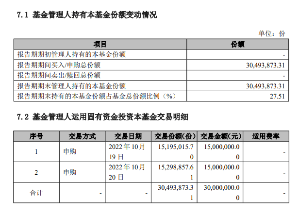 2022年10月21日,南方基金再次公告称,截至10月19日,该基金已连续20个工作日基金资产净值低于1亿元。之后,该基金2022年四季度报显示,报告期内基金管理人分别于2022年10月19日、10月20日分两次合计购入份额3049.4万份,总金额3000万元,持有份额占比由0涨至27.51%。一家机构投资者也在报告期内申购份额3049.4万份,期末持有份额占比28.48%。