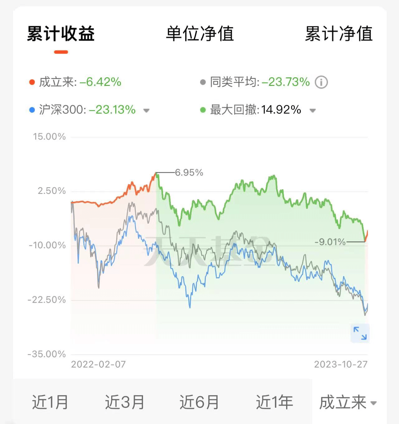 据天天基金网,该基金在去年8月取得成立来最好业绩回报6.95%,高于同类平均-1.29%和沪深300指数-9.80%,此后净值波动较大,在今年4月取得超过6%的累计收益后净值回落,10月23日取得成立来最差业绩回报-9.01%。