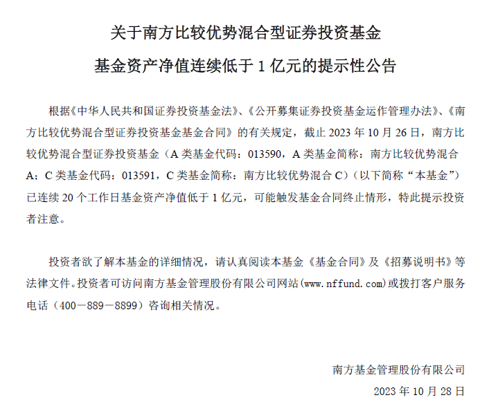 红星资本局10月30日消息,10月28日,南方基金旗下南方比较优势混合发布一则提示公告。公告显示,截止10月26日,该基金已连续20个工作日基金资产净值低于1亿元,可能触发基金合同终止情形,特此提示投资者注意。
