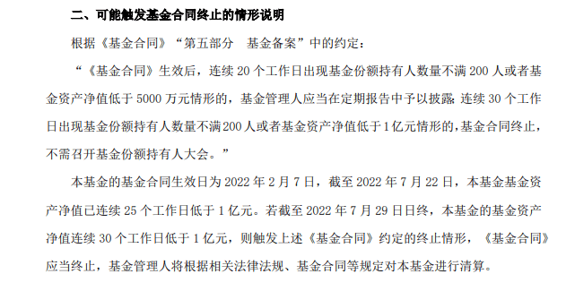 2022年7月5日,该基金发出首份提示公告称,截至当年7月1日,已连续10个工作日基金资产净值低于1亿元。2022年7月26日再次公告称,截至当年7月22日,资产净值已连续25个工作日低于1亿元。也就是说,这只基金从刚成立不到半年,就开始面临着清盘。