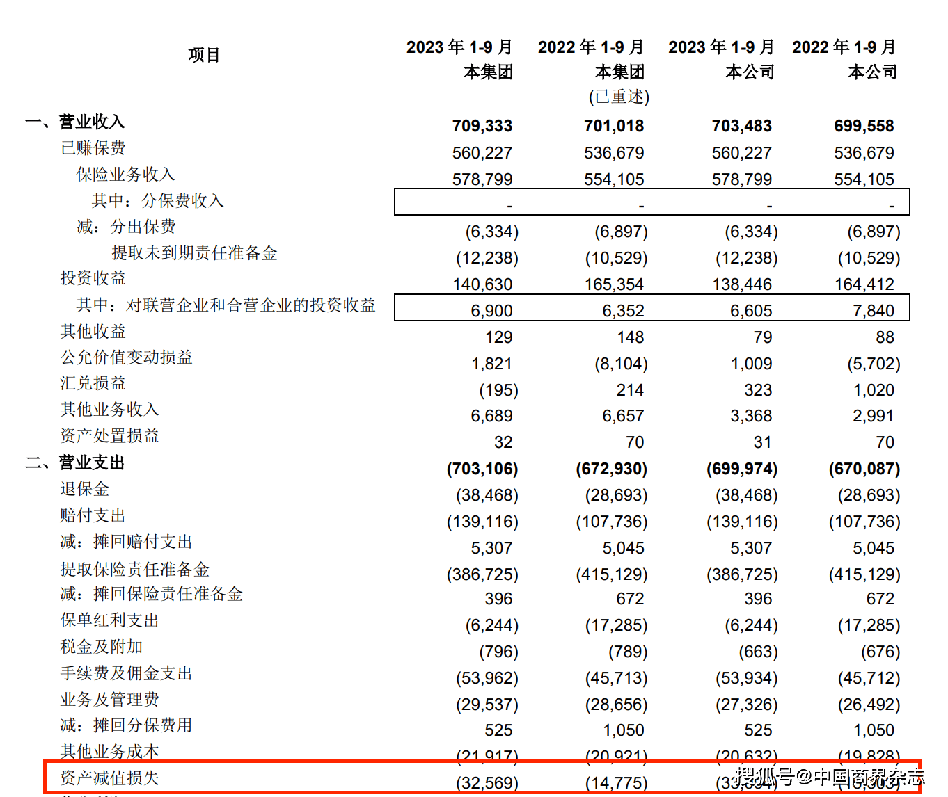 中国人寿三季报截图。