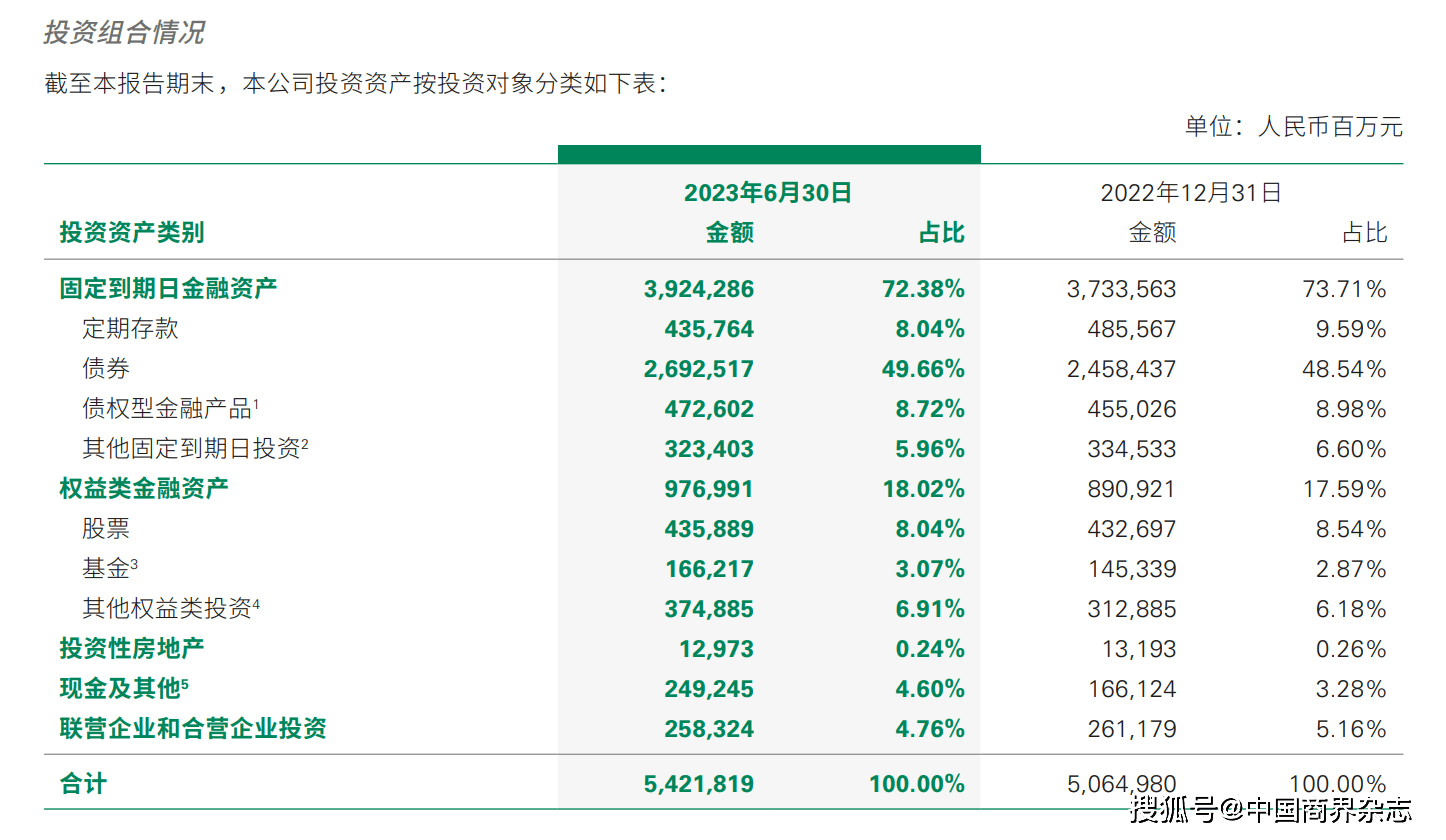 从中国人寿披露的半年报数据来看,权益类金融资产占比为18.02%,与2022年年底相比上调了0.43个百分点,股票在其中占比近一半。