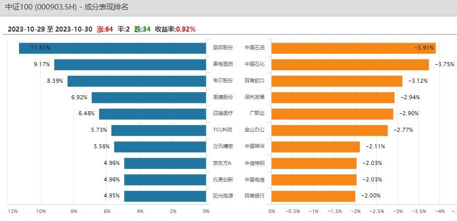周一(10月30日),A股三大指数集体收红,沪指微涨0.12%,深成指、创业板指表现更优。荟聚百只行业核心龙头的中证100指数午前开始发力,收盘涨近1%。市场量能进一步放大,成交额时隔两个月重回万亿元。