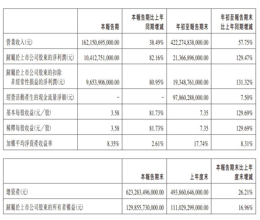 前三季度公司实现营业收入 4222.75 亿元,同比增长 57.75%;实现归母净利润 213.67 亿元,同比增长 129.47%。IT之家附业绩表如下: