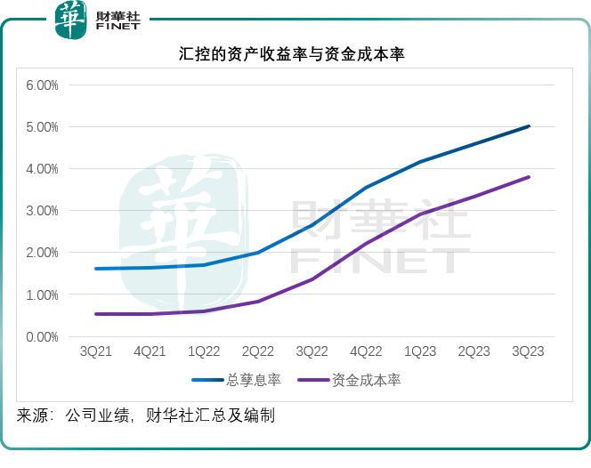财华社留意到,汇控的2023年第3季资金成本率为3.80%,按年上升244个基点,上升幅度比资产收益率的增幅235个基点高出8.89个基点。见下图,反映附息资产收益率的总孳息率与资金的使用成本率同步上升,而资金成本率的涨势似乎更陡一点。