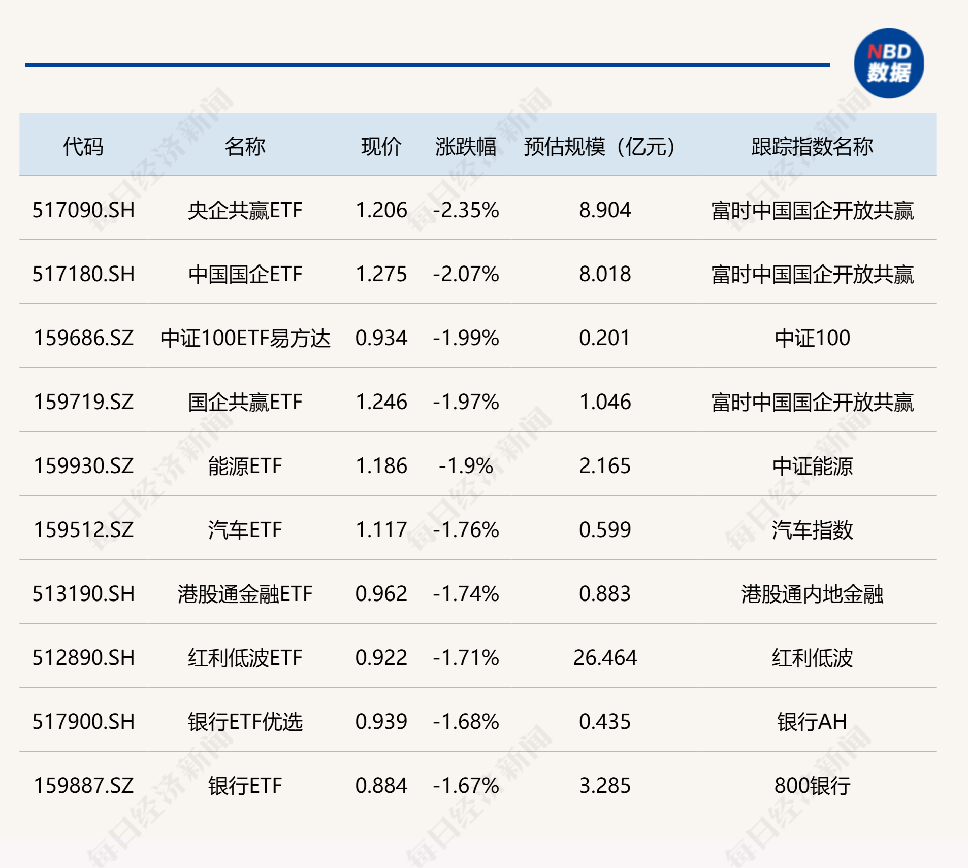 下跌方面,中字头、银行等相关ETF跌幅居前。