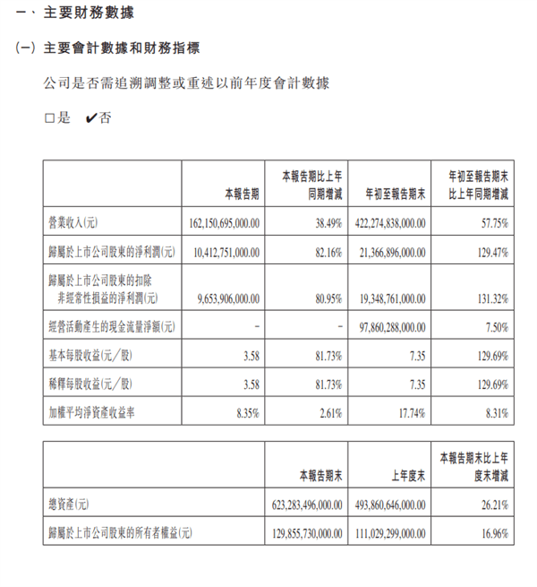第三季度归属于上市公司股东的净利润104.13亿元,同比增长82.16%。