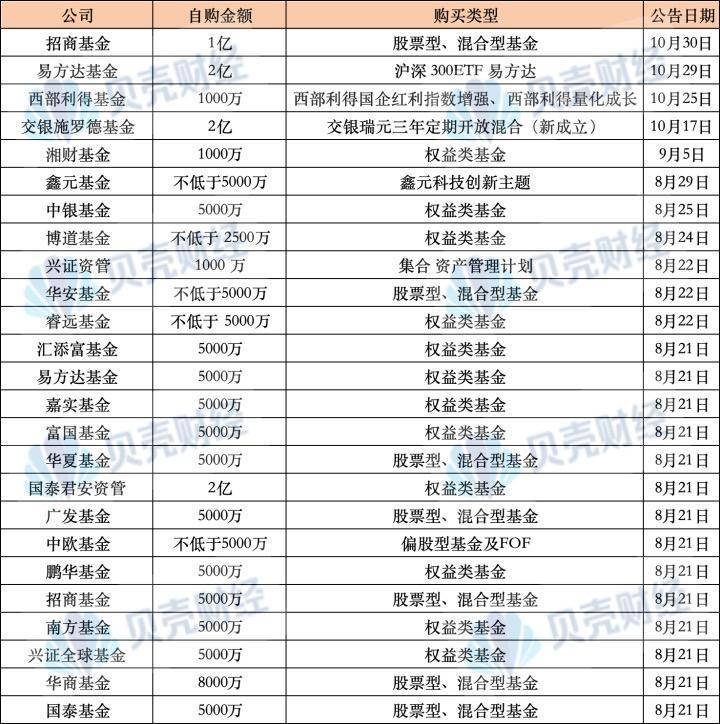 早在今年8月下旬,公募基金机构就已经掀起年内的第一波“自购潮”,彼时,中银基金、华安基金、兴证资管、国泰基金、华商基金、兴证全球基金、南方基金、招商基金、鹏华基金、中欧基金、广发基金、易方达基金、国泰君安资管、华夏基金、富国基金、嘉实基金等多家机构纷纷进行自购。