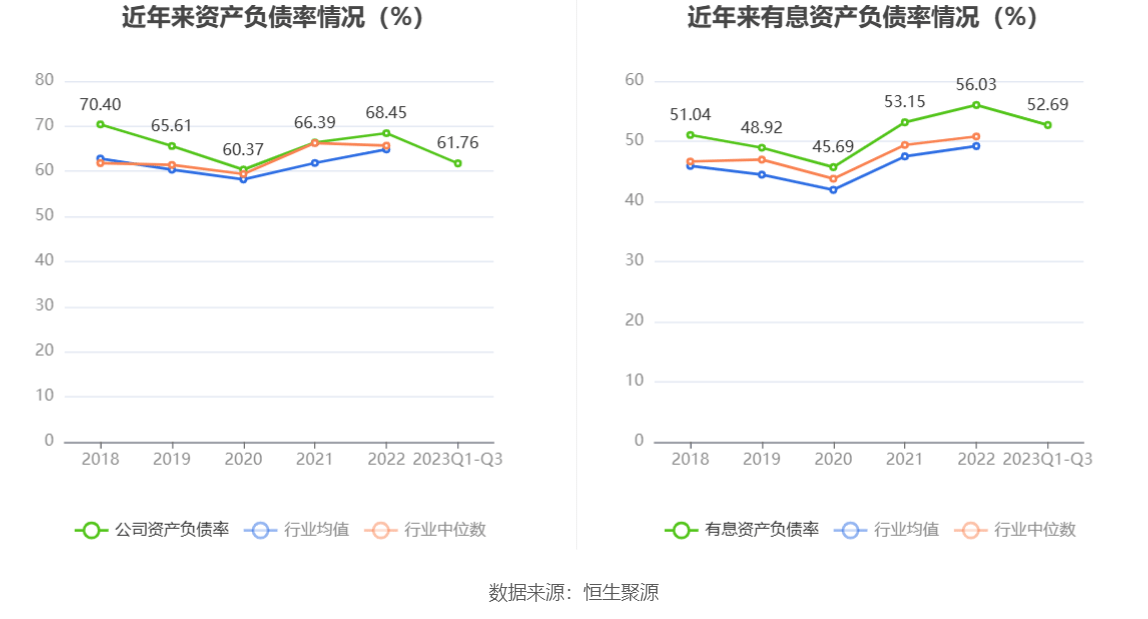 在偿债能力方面,公司2023年三季度末资产负债率为61.76%,相比上年末下降6.70个百分点;有息资产负债率为52.69%,相比上年末下降3.34个百分点。