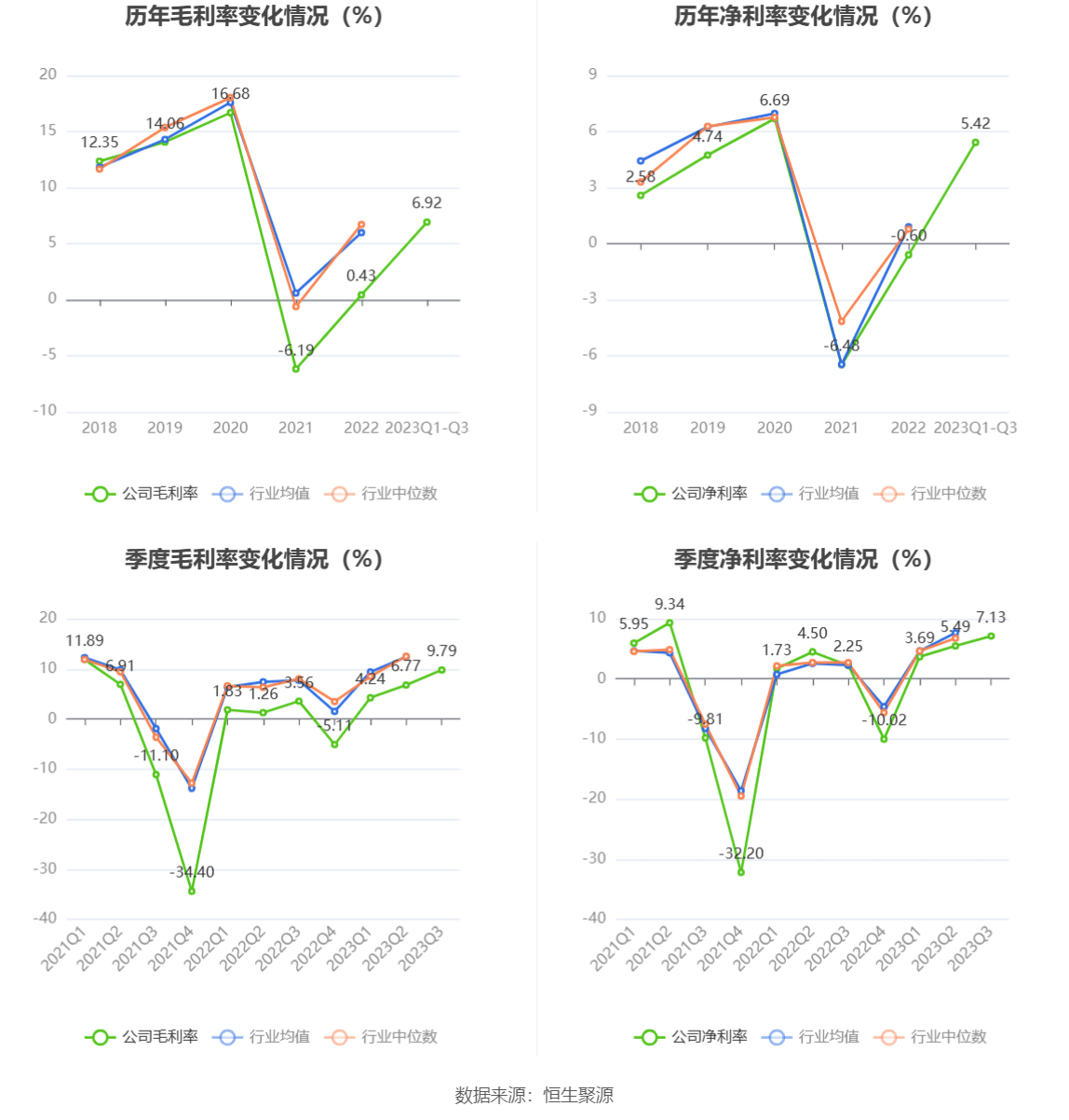 2023年前三季度,公司毛利率为6.92%,同比上升4.58个百分点;净利率为5.42%,较上年同期上升2.77个百分点。从单季度指标来看,2023年第三季度公司毛利率为9.79%,同比上升6.23个百分点,环比上升3.02个百分点;净利率为7.13%,较上年同期上升4.88个百分点,较上一季度上升1.64个百分点。