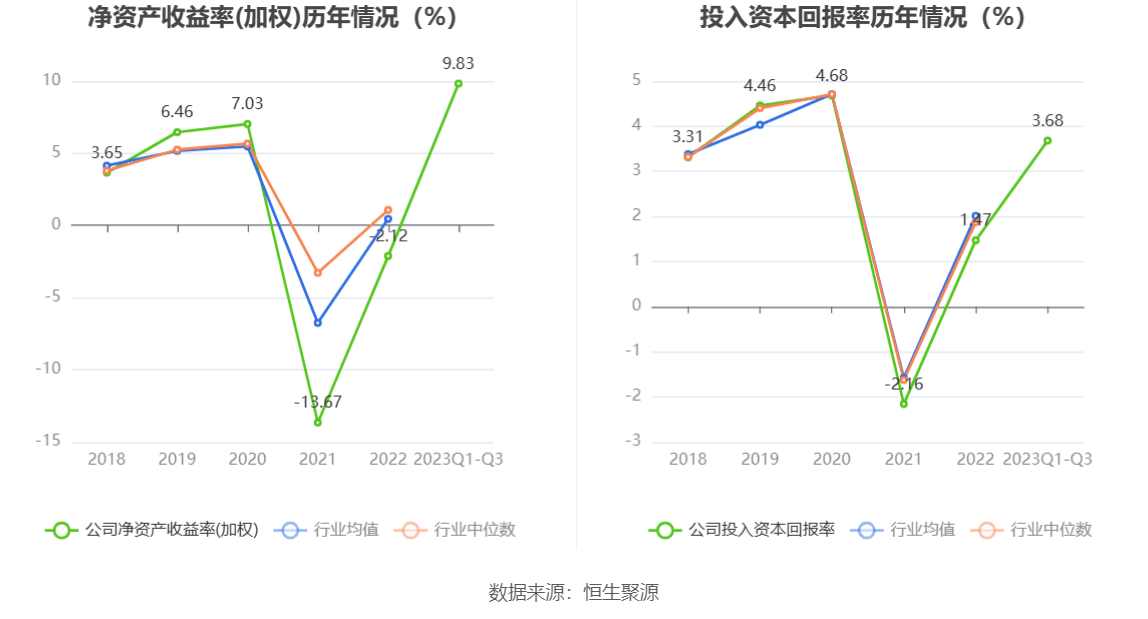 数据显示,2023年前三季度公司加权平均净资产收益率为9.83%,较上年同期增长5.66个百分点;公司2023年前三季度投入资本回报率为3.68%,较上年同期增长1.10个百分点。