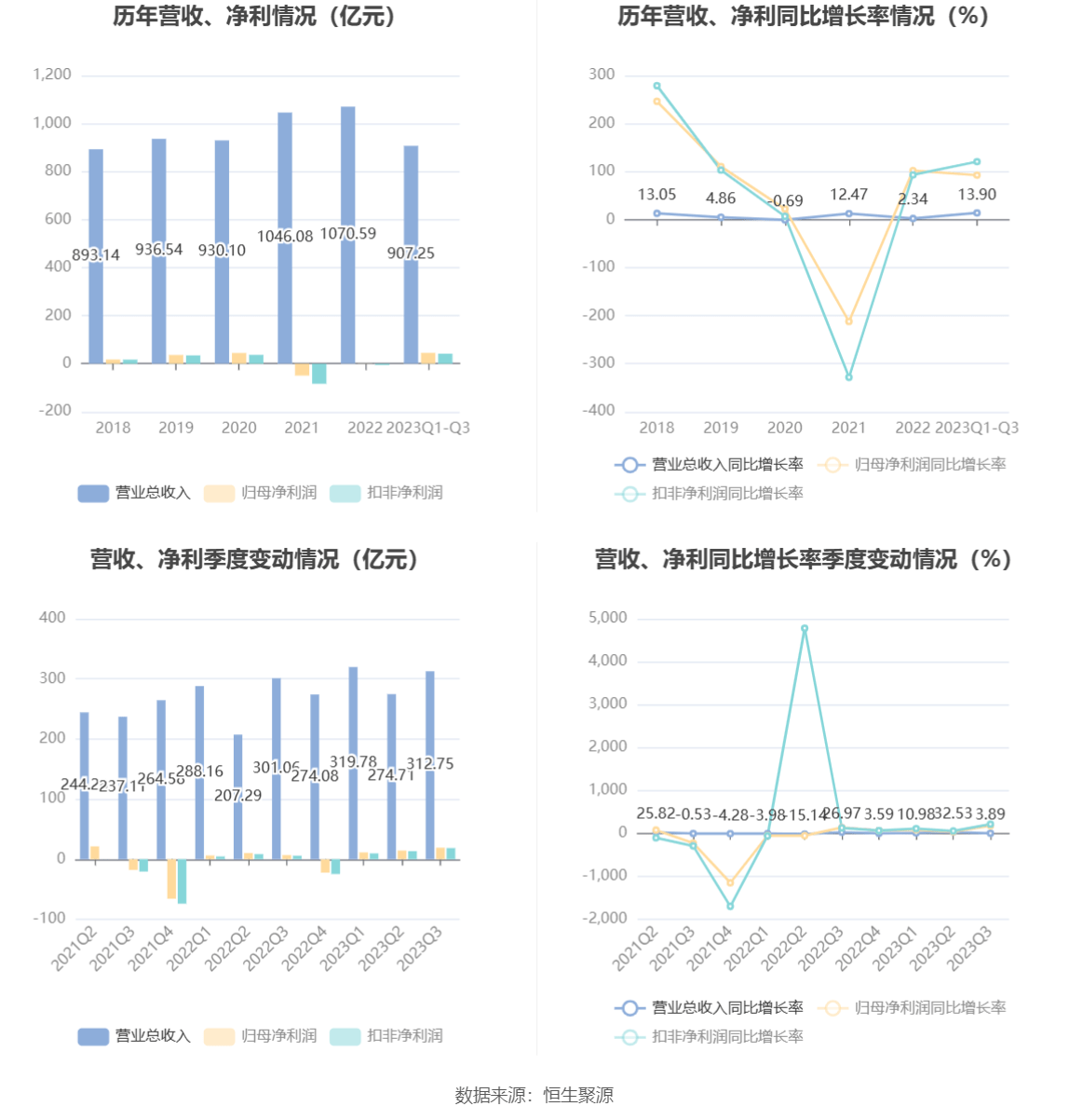 根据三季报,公司第三季度实现营业总收入312.75亿元,同比增长3.89%,环比增长13.85%;归母净利润19.17亿元,同比增长181.43%,环比增长32.38%;扣非净利润18.52亿元,同比增长215.82%,环比增长38.39%。