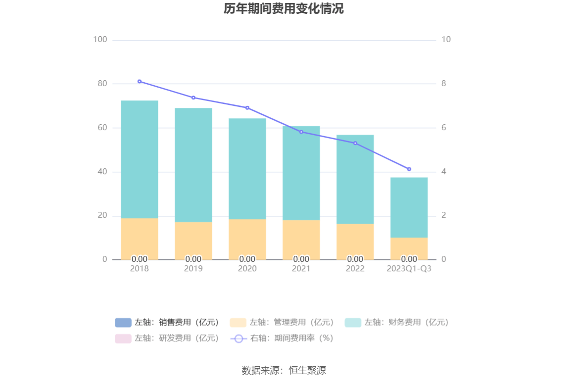 2023年前三季度,公司期间费用为37.49亿元,较上年同期减少2.26亿元;期间费用率为4.13%,较上年同期下降0.86个百分点。其中,管理费用同比增长3.67%,财务费用同比下降8.71%。