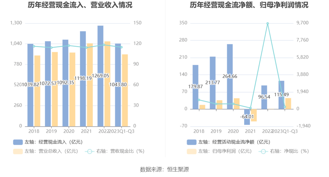 2023年前三季度,公司营业收入现金比为115.05%,净现比为256.74%。