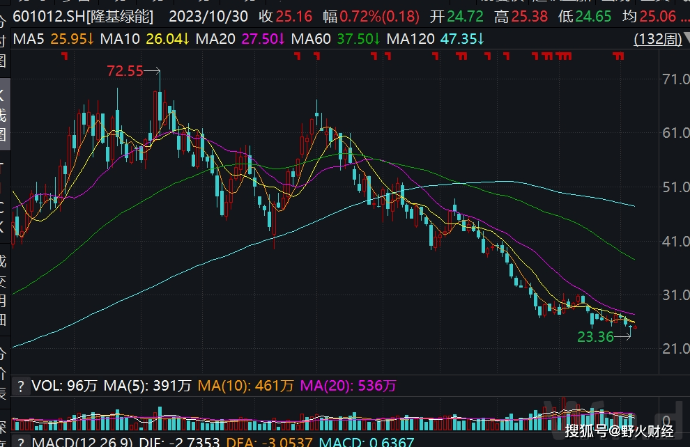 截至10月30日,隆基市值1907亿元,领先另两个光伏千亿企业即阳光电源和通威股份,最新股价25元多,和历史高点72元相比,跌幅近2/3。
