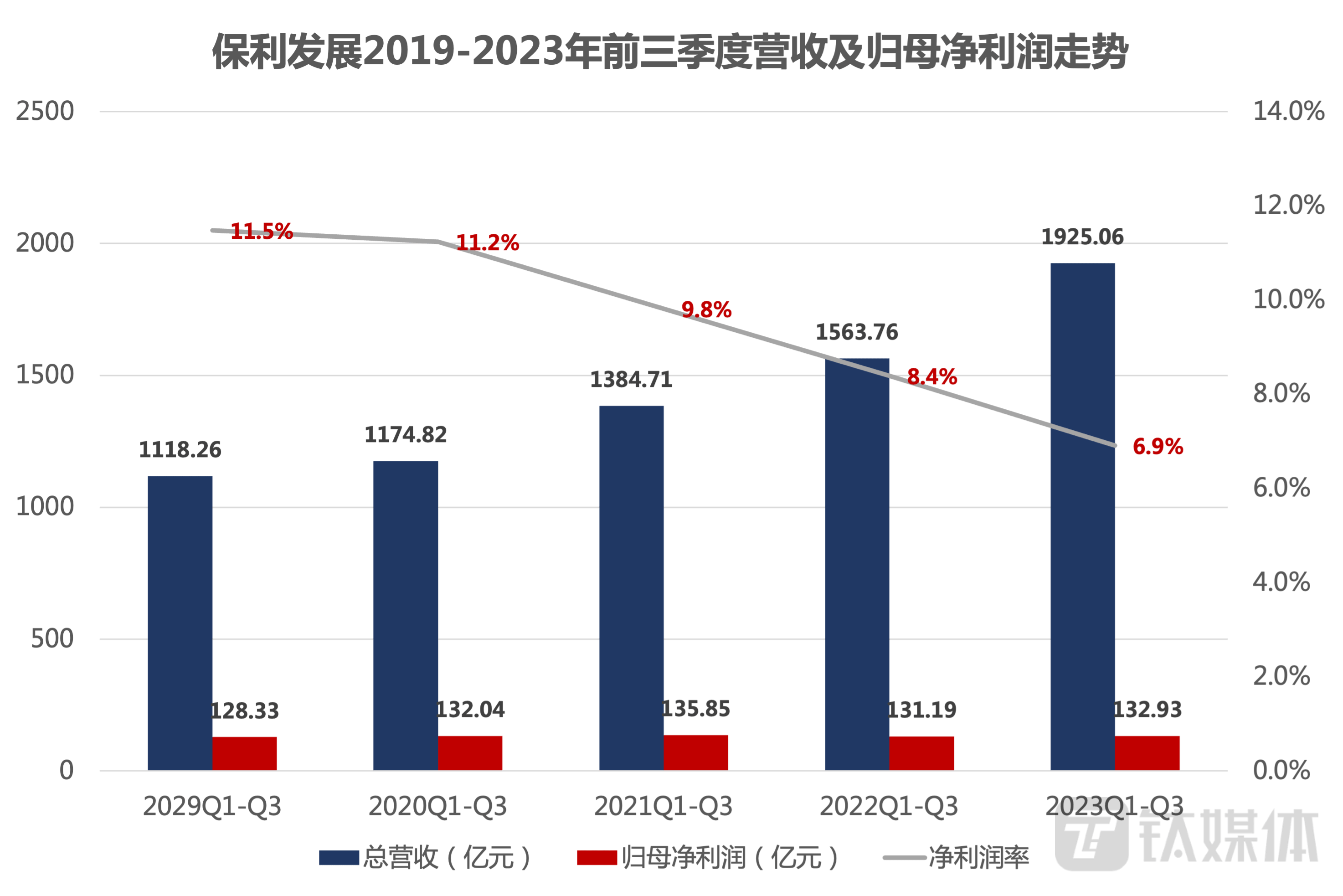 前三季度,保利发展累计营收1925.06亿元,同比增长23.10%;归母净利润132.93亿元,同比增长1.33%;扣非归母净利润126.93亿元,同比增长2.12%。
