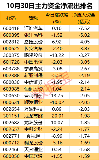 有13股主力资金净流出超2亿元,江淮汽车、张江高科、恩捷股份遭主力资金抛售超4亿元;长安汽车、鹏翎股份、中国电信、宁波高发也遭主力资金抛售。