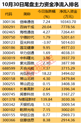 个股方面,信维通信尾盘获主力抢筹超1亿元;百纳千成、海格通信、宁德时代、亚光科技尾盘获主力资金抢筹超5000万元。