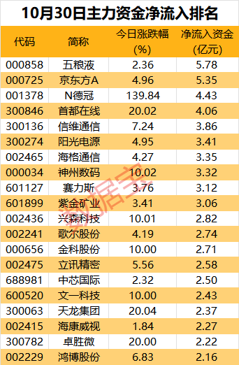 从个股看,沪深两市10股主力资金净流入超3亿元。