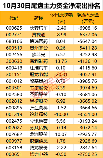 长安汽车、真视通、博瑞医药、贵州茅台尾盘遭主力净流出超5000万元。