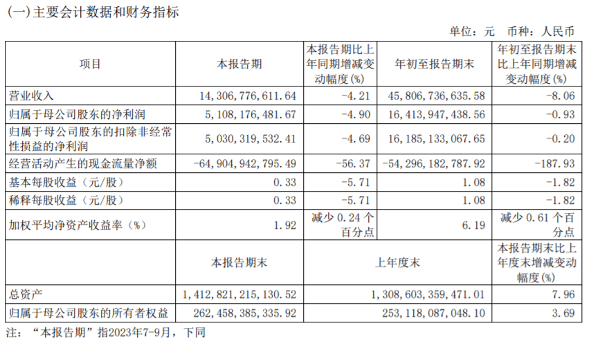 10月30日晚间,中信证券发布《2023年第三季度报告》称,今年第三季度,公司营业收入为143.07亿元,同比(与前一年同期相较)减少4.21%;归属于母公司股东的净利润(下称“净利润”)为51.08亿元,同比减少4.90%。