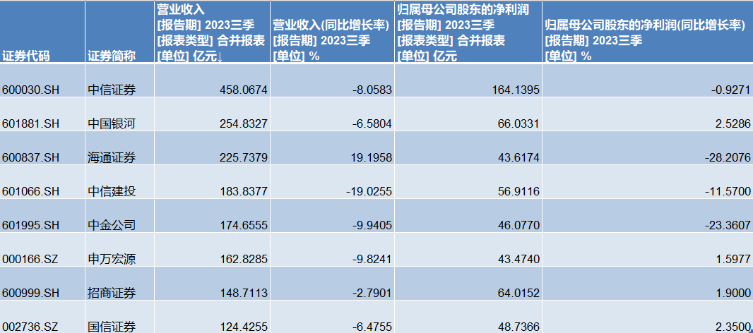 中信证券业绩的下滑,也是头部券商前三季度表现整体不佳的缩影。