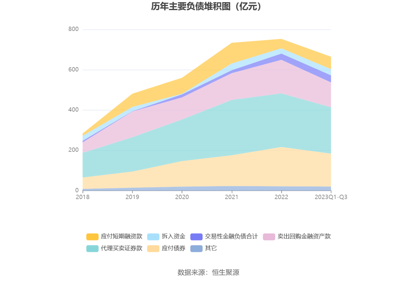 负债重大变化方面,截至2023年三季度末,公司卖出回购金融资产款较上年末减少26.17%,占公司总资产比重下降3.26个百分点;代理买卖证券款较上年末减少13.47%,占公司总资产比重下降1.41个百分点;应付债券较上年末减少16.36%,占公司总资产比重下降1.67个百分点;应付短期融资款较上年末增加33.12%,占公司总资产比重上升2.18个百分点。
