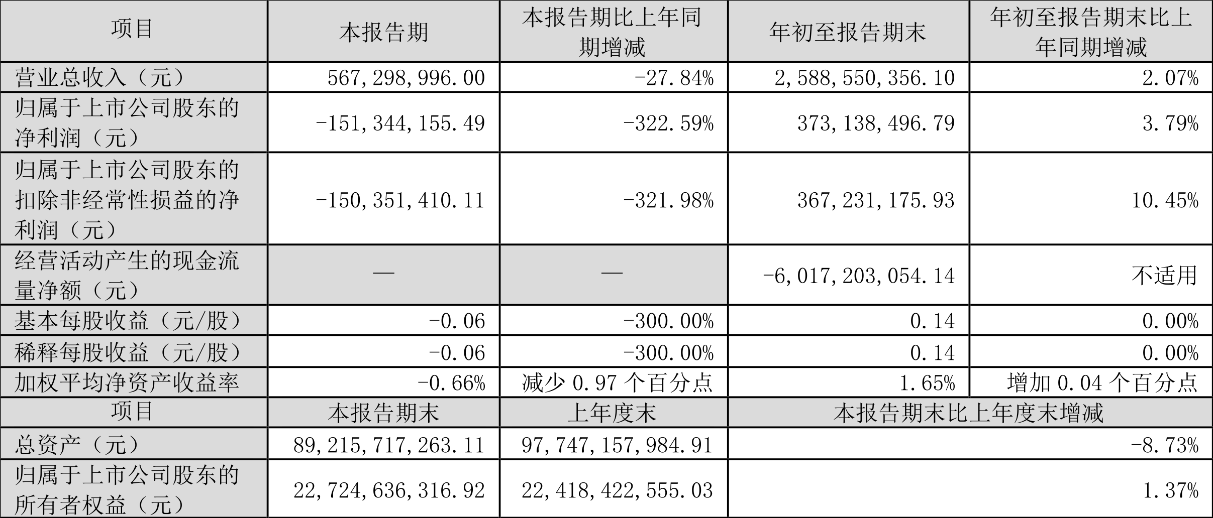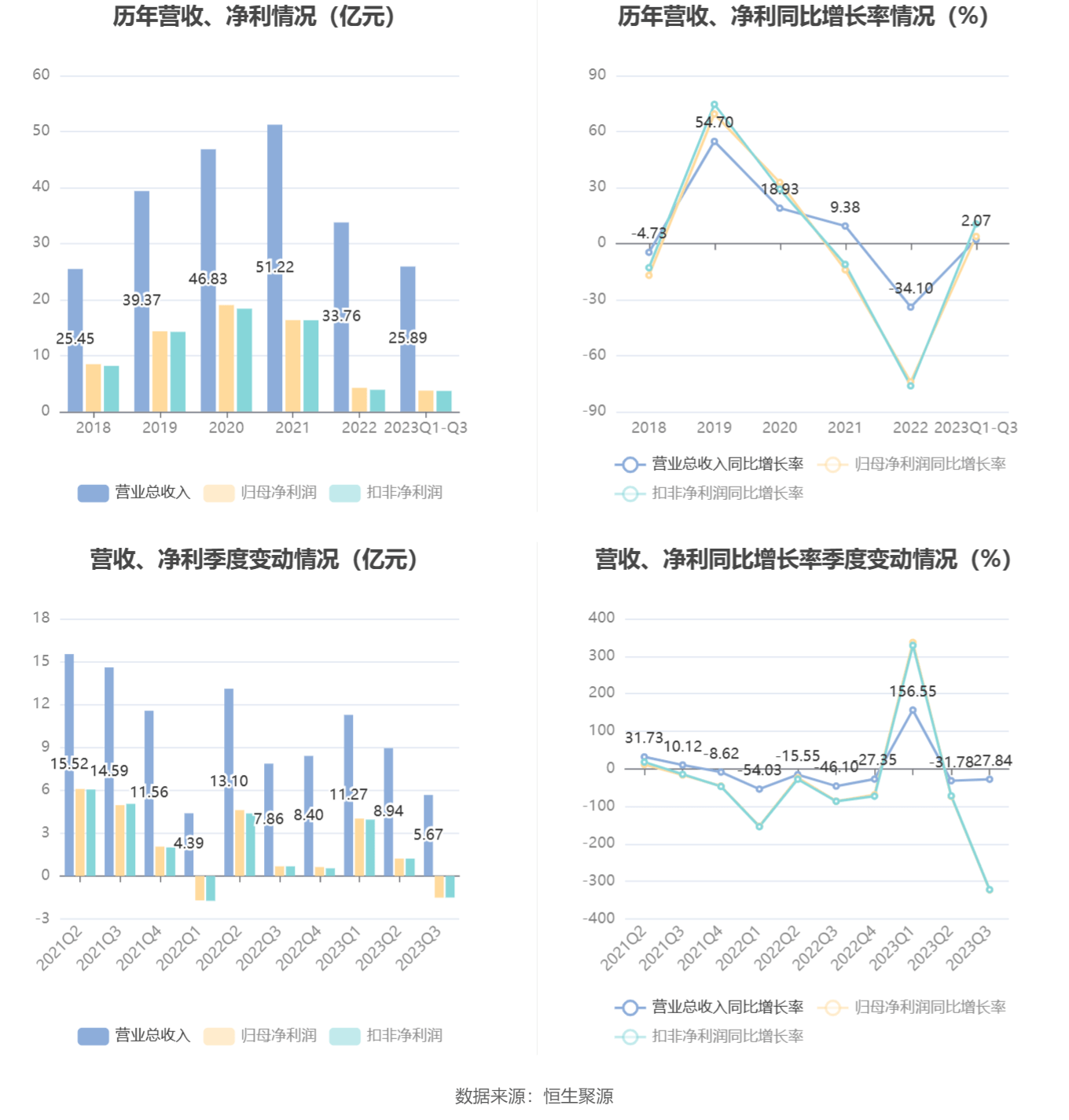 根据三季报,公司第三季度实现营业总收入5.67亿元,同比下降27.84%,环比下降36.54%;归母净利润-1.51亿元,同比下降322.59%,环比下降223.87%;扣非净利润-1.5亿元,同比下降321.98%,环比下降222.98%。